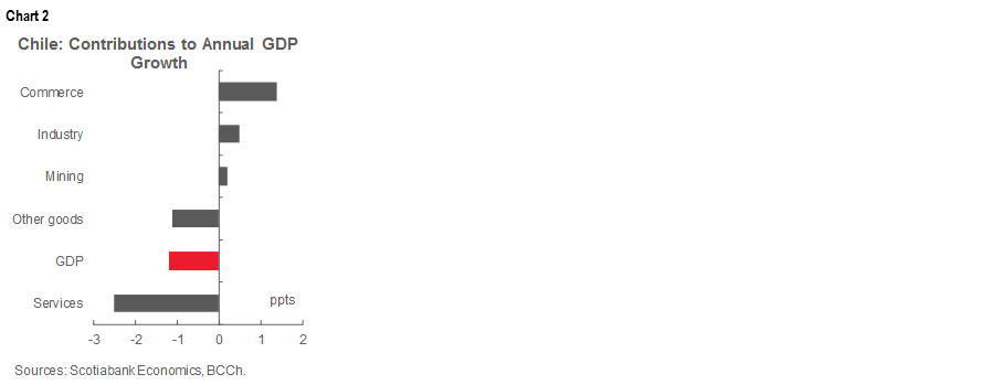 The details highlight the sources of October’s difficulties, which were centred in services. Non-mining activity contracted by -0.5% m/m sa (-1.5% y/y), mainly owing to a slowdown in services linked to investment that had shown some recovery in September. Indeed, services contracted by -3.3% mm sa after robust 8.2% m/m sa gains in September; this resulted in a drag of -2.5 ppts on October’s -1.2% y/y headline growth (chart 2). Construction also recorded a sizable monthly decline, which provided evidence that health restrictions and the fragility of the labour market are keeping negative output gaps in place.