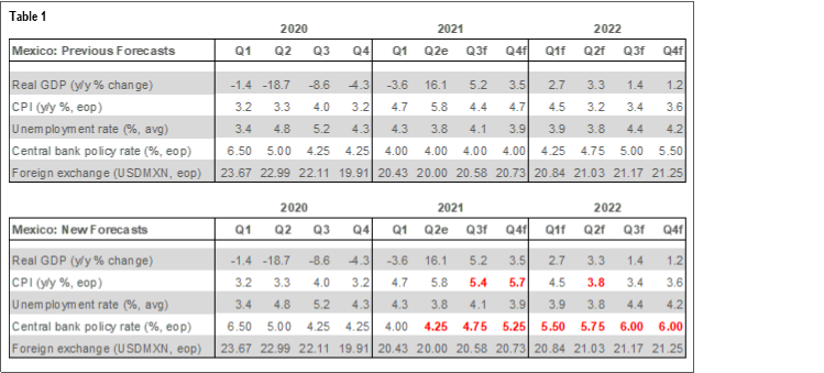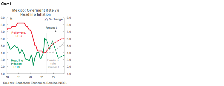 We have also adjusted our longer-term profile for monetary policy in Mexico to a 6.00% terminal rate by Q3-2022—essentially the neutral real policy rate based on our inflation forecasts—up from 5.50% in Q4-2022 in our previous forecast.