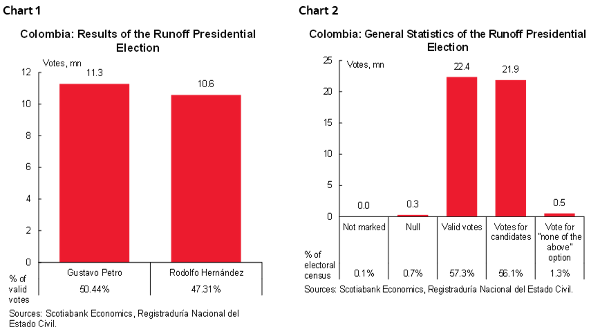 Leftist candidate Gustavo Petro was elected President in the June 19th runoff election with 11.3 million votes (50.44%), while the independent candidate, Rodolfo Hernández, received 10.58 million votes (47.31%) (chart 1). Turnout was 58.09% (22.66 million) (chart 2), above the 54.91% level in the first round and the strongest turnout observed since the 1998 elections (62.59%) when the conservative Andrés Pastrana was elected.