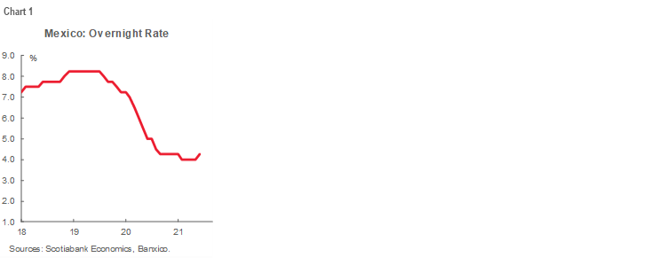 In a split decision, the Board of Mexico’s central bank (Banxico) delivered a surprise 25 bps hike, raising the overnight rate from 4.00% to 4.25% (chart 1). Two of five board members voted to hold. Factoring into the decision was the possibility that central banks from emerging markets would start tightening earlier than anticipated. The board now sees balanced risks to growth, even if Banxico still sees slack in the economy for the remainder of the year.