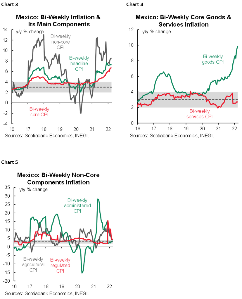 On a sequential two-week basis, headline inflation came in at 0.48% 2w/2w, marginally higher than the previous biweekly period level of 0.42% 2w/2w but below consensus (0.53% 2w/2w). Core inflation also surprised downward at 0.35% 2w/2w (0.32% 2w/2w previously, 0.41% 2w/2w consensus). Merchandise prices rose from 0.41% 2w/2w to 0.49% 2w/2w, and services stood at 0.20% 2w/2w (0.21% 2w/2w previously). Non-core inflation increased to 0.86% 2w/2w (0.71% 2w/2w previously). It is worth highlighting the increase in the energy component, which rose 1.82% 2w/2w from 0.52% previously.