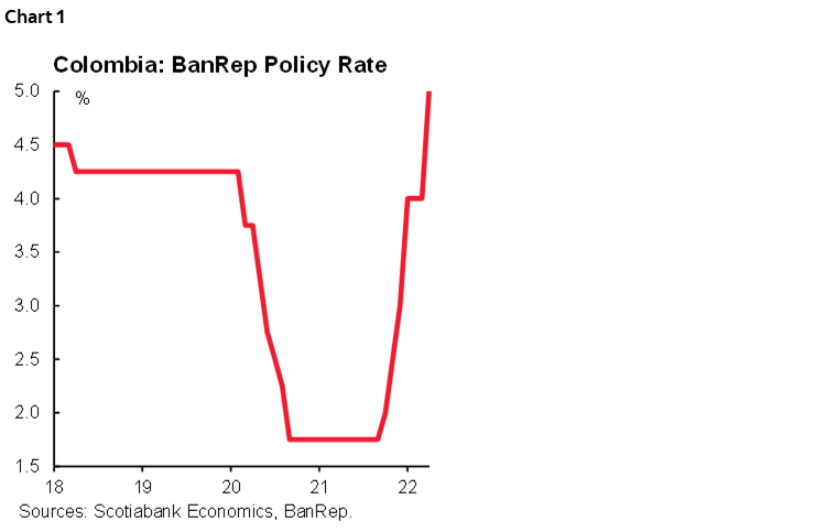 Colombia’s central bank (BanRep) raised the monetary policy rate by 100 bps to 5.00% (chart 1), below the market consensus of 150 bps (also Scotiabank Economics' expectation). The decision came in a split decision, with five members of the Board voting for a 100 bps hike and two members voting for a 150 bps increase. The central bank presented a positive outlook for the economy and upgraded its GDP growth forecast to 4.7% from 4.3%. However, BanRep noted the upside pressure on international prices from Russia’s invasion of Ukraine. The Board highlighted that uncertainty with respect to the recovery remains high and considers the 100 bps hike a significant move in the pursuit of price stability and will help anchor inflation expectations.