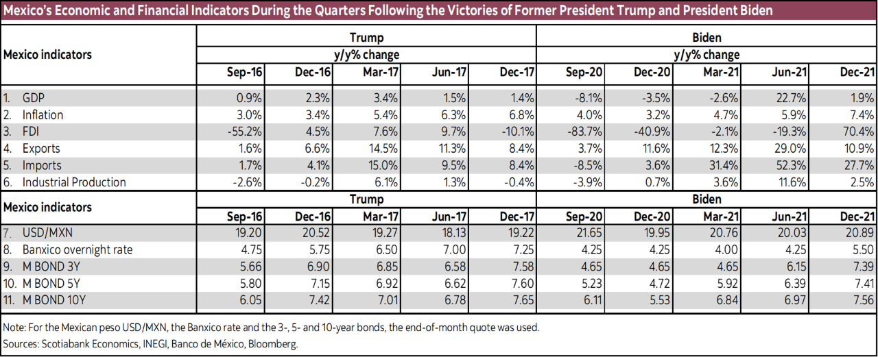 Before we continue, we would like to present a historical comparison between the first few months in both former President Trump’s and President Biden’s terms and some of Mexico’s economic and financial variables.