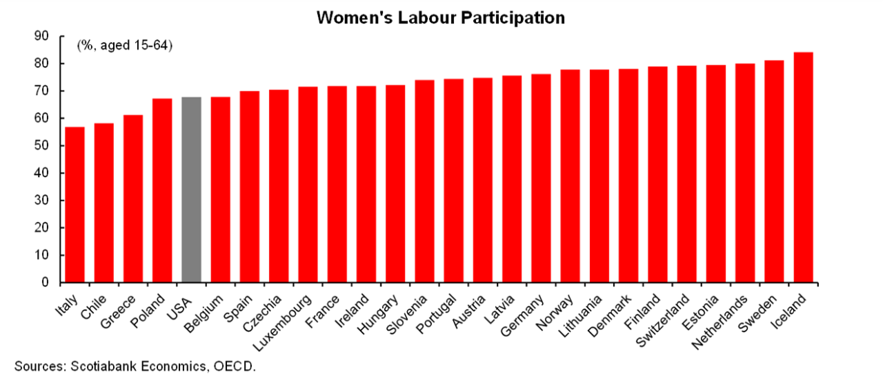 Although details are still emerging on plan specifics, Vice President Kamala Harris has indicated she plans to boost the so called “care economy” (a welfare plan with some elements that could boost female participation in the labour force) as well as put forth a stronger inclusion agenda. The World Bank recently published a report that showed that flexibility and telework can increase female labour force participation, as it did during the pandemic (“Understanding the Main Determinants of Telework and Its Role in Women’s Labor Participation,” G. Inchauste, M. C Siravenga: World Bank: September 2024). Details on Harris’ plans on this front are still scant, but the United States has among the lowest female participation rates in the OECD (at 68% vs. 80%+ in some northern European nations) and boosting it would relax one of the strongest constraints the United States has in absorbing more global investment-labour scarcity. On one hand, a higher female participation rate in the United States would boost the size of its labour force, adding to its capacity to attract investment (making it a competitor for Mexico in some sectors), but on the other (positive) side it would also raise the number of double-income households that would add to U.S. demand which, in turn, benefits Mexican exports. Hence, we believe the impact of this is mixed.