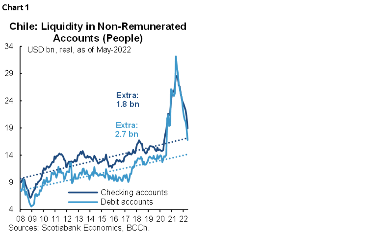 In this context, the central bank adjusted its forecast for the 2022 GDP growth from 1.5% to the range 1.5–2.25% in June’s Monetary Policy Report. In its report, the central bank recognized that the speed at which the economy is slowing is less than expected. The component that exceeded the BCCh’s expectations has been consumption, though we have observed that private investment has also shown somewhat greater resilience, especially with respect to machinery and equipment.