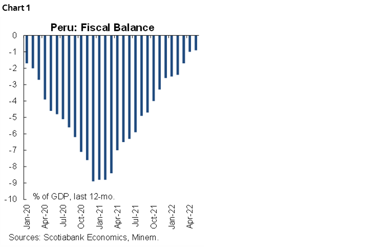 The most refreshing aspect of Peru’s economy is probably the fiscal deficit, which came out at 0.9% of GDP to May on June 6 (chart 1). Based on this, we are revising our 2022 fiscal deficit forecast, currently at 2.0% of GDP, to 1.5%. This is our second adjustment in as many months. Initially, we had forecast a 3.0% of GDP deficit. Peru’s fiscal situation is, evidently, very strong. In early 2020 the fiscal deficit had peaked at 8.9% of GDP and there was a general idea that it would take the better part of a decade to get it back into fiscal rule territory of 1% of GDP. And yet, here we are only two and half years later. Even if the fiscal deficit begins to rise during the remainder of 2022, as we expect, it should still stay significantly ahead of the official fiscal rule schedule of 2.5% of GDP in 2022 before descending towards 1.0% in 2026.