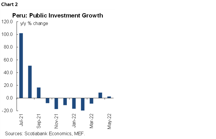The strength of the fiscal accounts gives Peru’s authorities plenty of room for an expansionary policy or for measures that seek to compensate for rising inflation. The government has already established a stabilization fund for certain fuel products, as well as tax benefits for a number of staple goods. More tax benefits of this nature could occur. Even so, the fiscal picture is not likely to change unless the government begins to spend in earnest. Public investment, in particular, is dragging (chart 2). This may continue in 2023, as new authorities will be elected this coming October. This changeover normally causes a discontinuity in the investment schedule.