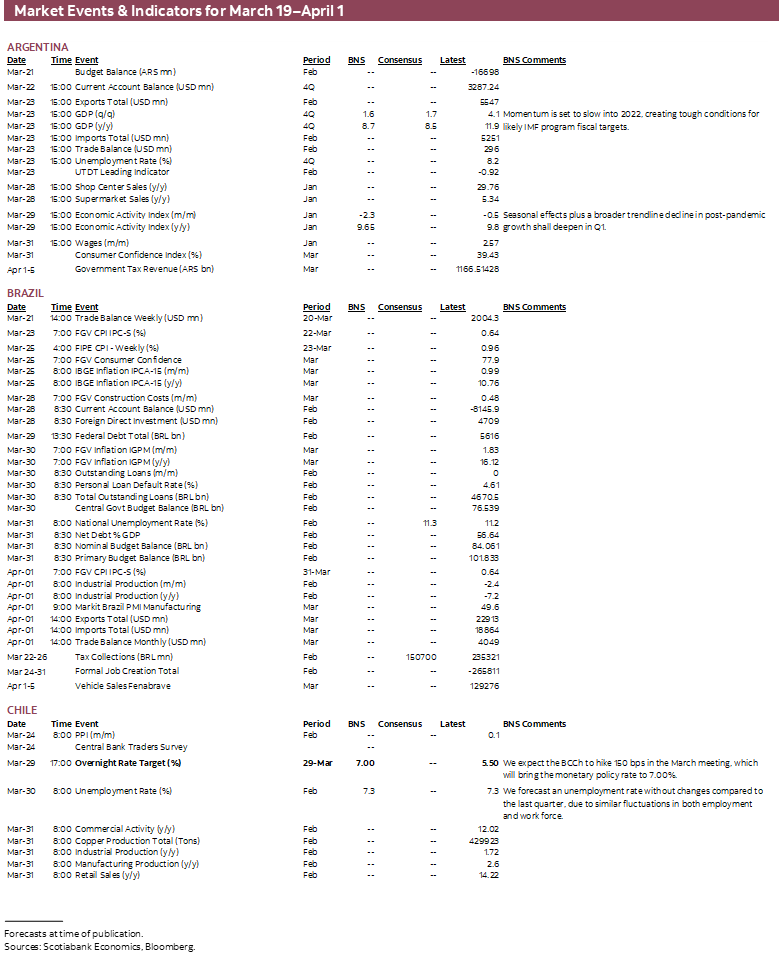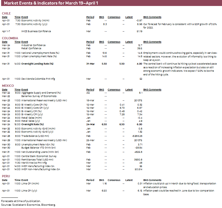 In this environment of heightened uncertainty, the calibration of monetary policy has become even more critical. In Brazil, where the economy seems precariously perched on the edge of stagflation, the BCB hiked its key Selic rate by 100 bps, on March 16, in response to higher inflation that threatens to bleed over into expectations; Scotiabank’s experts now call for the benchmark rate to peak at 13.5% in the second quarter of 2022, up from 12.25%. The BCB is a single-mandate inflation-targeting central bank that focuses exclusively on inflation control. However, that isn’t the case with respect to central banks in the region that have dual mandates (inflation and growth), even if that is defined in terms of “efficiency” of inflation control (i.e., minimizing the output losses needed to ensure price stability). And in calibrating their monetary policy responses, other central banks incorporate inflation and output (output gap) objectives. Nevertheless, as Scotiabank’s team in Bogota discusses below (see Country Updates), assessing the appropriate stance of monetary policy using a reaction function approach likewise leads to the conclusion that the profile of policy rates must be ramped up. To achieve its objectives, BanRep will have to move more aggressively, with two 150 bps hikes in March and April, followed by a further 50 bps in June, to bring the policy rate to 7.50%. In response to the commodity price shock, Scotiabank economists in Lima have also raised their forecast for Peru’s policy rate, which is now expected to peak at 5.0%, up from 4.5%.