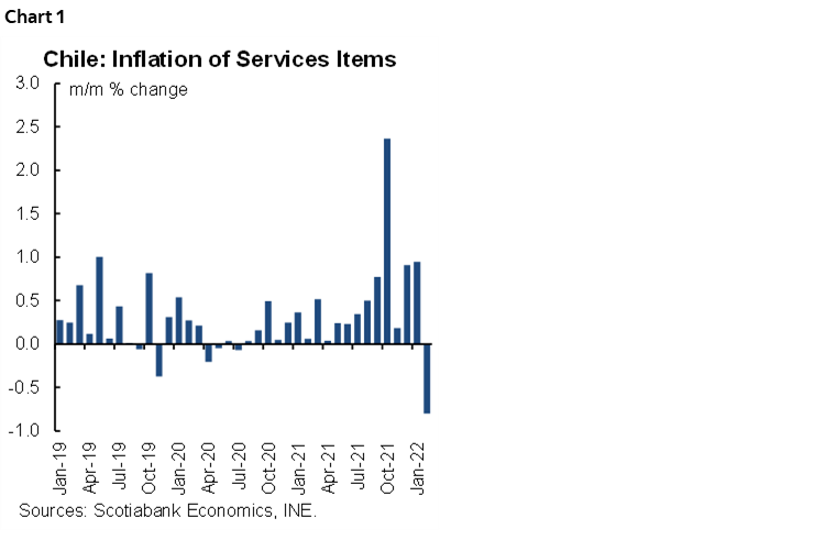 On Tuesday, March 8, the statistical agency INE released the CPI for February, which increased 0.3% m/m (7.8% y/y). Higher food and fuel prices, somewhat offset by declines in goods and services prices resulting from the downward correction of tourist packages and air transport services, explain this result. The drop in services prices was explained in part by the reversal of the unusual price rises observed last October (chart 1). Looking forward, inflation pressures will continue in the short term, but are expected to decrease in the second half of 2022.
