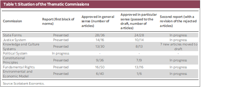 In the last two weeks, the Assembly approved 13 articles (of 16 approved in principle) from the Fundamental Rights Commission, as well as seven articles (of a total of nine previously approved) from the Constitutional Principles Commission. These articles will be incorporated in the draft of the new constitution. The Assembly also approved one article (of a total of six approved in principle) from the report by the Environment Commission, which likewise passes to the draft of the new constitution. The Knowledge and Culture Systems Commission presented its second report to the plenary with modifications to the rejected articles, of which seven new norms were approved by the floor of the convention and will move to the draft of the new constitution (table 1).