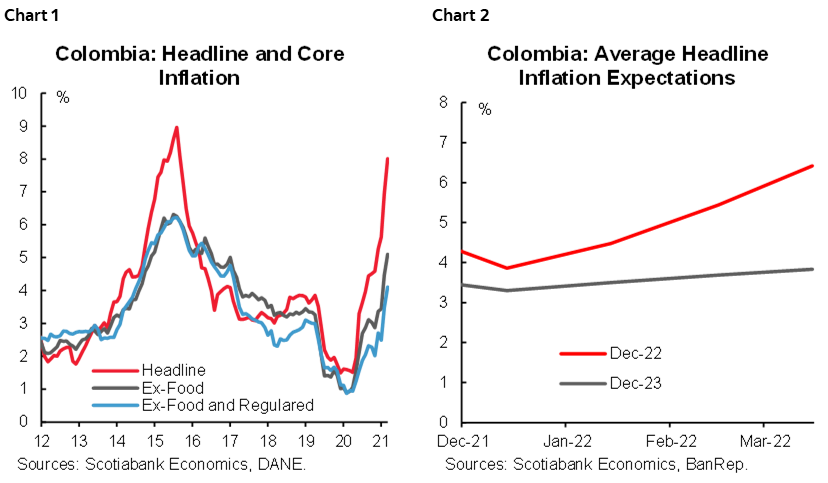 The Colombian economy has started 2022 with steam. In fact, coincident indicators for January showed an economy that continues closing the output gap, while other indicators such as energy demand and tax collection also showed continued strength in Q1-2022. However, there is evidence that companies and households are not as confident. Persistent inflation has raised production costs (higher input prices) and reduced household disposable income, especially for lower income households, since February food inflation was above 23% y/y while lodging and utilities increased 8.86% y/y, both of which are key expenditure items. In addition, headline and core inflation measures have surprised markets and analysts for three consecutive months, with December 2022 inflation expectations at 6.46%, and expectations for December 2023 now at 4%. The central bank (BanRep) probably needs to accelerate its hiking cycle, even if that means shifting to a contractionary policy stance for a short period of time. The question is by how much.