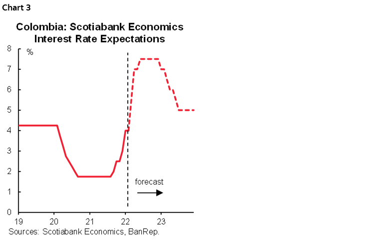 From the perspective of an orthodox inflation-targeting central bank’s reaction function, recent increases in headline, core, and expected inflation means that BanRep must act faster and perhaps more aggressively. In fact, our model points to two 150 bps hikes in the March and April meetings, followed by a 50 bps hike in June to bring the policy rate to 7.5%. Having said that, the model also indicates that, in a scenario in which inflation peaks at 8.32% by March 2022 and starts to slowly converge to the target, returning to the target range (2–4%) by March of next year, BanRep should start to slowly cut the policy rate starting in January 2023 to achieve a neutral rate of 5.0% by the end next year (chart 3). This profile would keep the real (inflation-adjusted) policy rate close to neutral so as limit the damage to domestic demand.