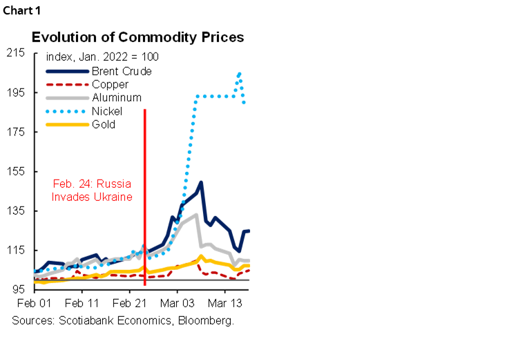 The most immediate impact of Russian aggression has been a spike in commodity prices (chart 1). World prices of commodities from oil to wheat have jumped as markets have priced-in the possible effects of sanctions on Russian oil exports and disruptions to the spring planting of cereal crops in Ukraine. Higher commodity prices, which had been trending up even before the Russian invasion, have fed through to inflation across the Latam region and around the globe. Price moves over the past several weeks will exacerbate those effects.