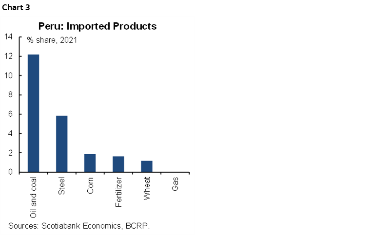 Peru is another country to watch. Like Chile, it has benefited from higher metal prices, but more recent increases in oil and cereals prices expose it to large import price shocks (see discussion below). Inflationary pressures from imports of key products—oil, wheat, edible oils, corn, and fertilizer—will erode real incomes (chart 3). In this respect, while the direct exposure to the conflict is limited, with Russia and Ukraine accounting for only about two percent of Peru’s total trade, between 20% and 25% of total imports are fuel and other commodities and there is no way to avoid the effects of higher prices. As Scotiabank’s team in Lima put it, smaller trade balances may be a harbinger of things to come. In this regard, Peru underscores the importance of “separating the wheat from the oil”.
