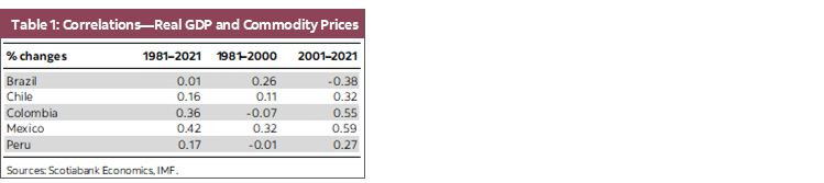 Not only are there large differences across countries, but there are also significant changes in correlations over time. These changes are evident in a comparison of two time periods, 1981–2000 and 2001–2021. Significantly, for most countries, the correlation increased over time, with the sign switching from negative to positive in the case of Colombia and Peru. (Brazil is an anomaly here in that terms-of-trade shocks are negatively correlated with GDP.) Such changes may be explained by a range of factors related to structural changes and economic development—the degree to which production is diversified across different industries, openness to external trade, etc. Whatever the underlying factors driving them, these changes suggest that Latam countries are likely more exposed to terms-of-trade shocks today than they were 20 years ago.