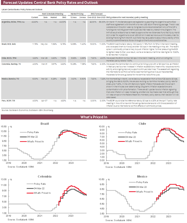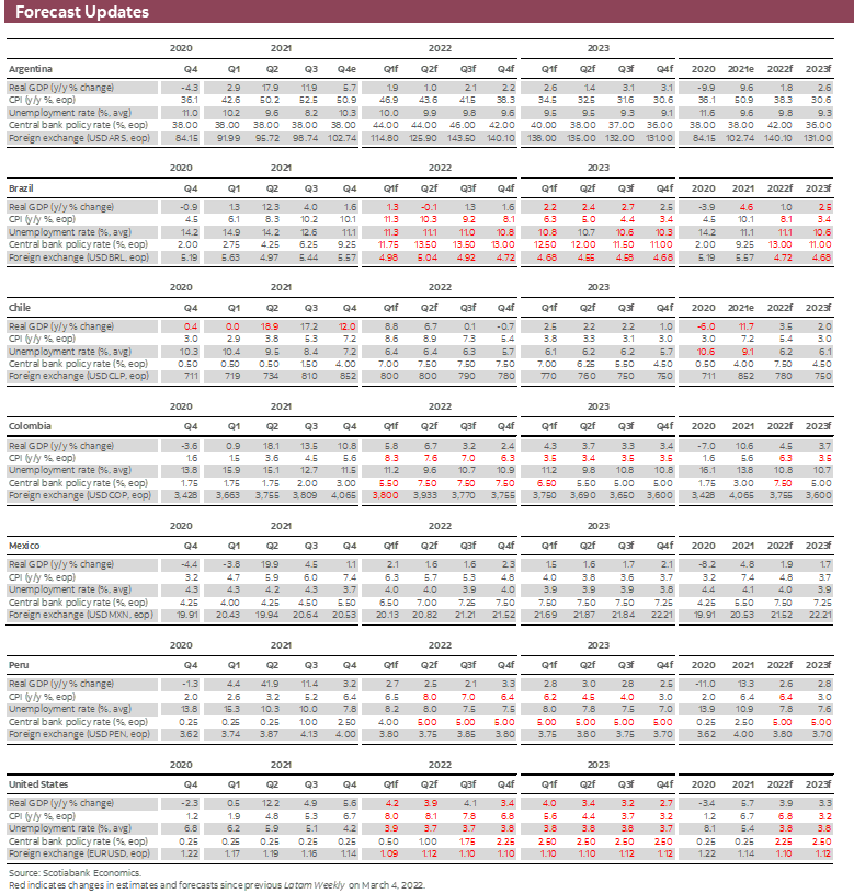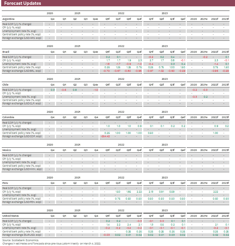 - Higher headline inflation and rising core and expected inflation have led Scotiabank economists in the Latam region to revise their forecasts. See the full set of changes in the forecast tables below. Further revisions are likely in the weeks ahead as geopolitical developments spill over to commodity prices and disrupt global supply chains.