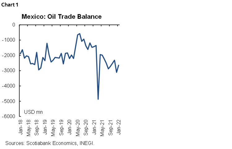 As we have written in the past, the long-held stereotype that Mexico is an oil exporter no longer applies (chart 1). In fact, the recent Mexican oil trade deficit has been hovering in a USD 2–3 bn per month range. Our estimates suggest that if oil prices continue to hover around USD 100/bl, we could see that monthly oil trade deficit spike to around USD 5 bn. However, it’s also worth noting that if we look at the oil balance by sector, then the country’s public sector runs a surplus (much of it through crude oil), while the private sector runs a deficit which reflects its consumption of gasoline and petrochemicals.
