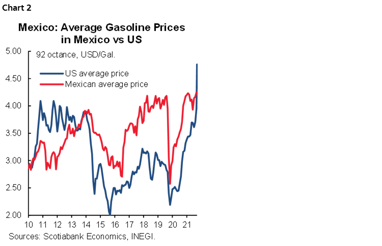 The first impact of the shock for an oil importer will likely be the widening trade deficit as discussed. This already explains the year-to-date underperformance of MXN relative to regional peers, which have appreciated against the US dollar (BRL +12.0%, COP +6.7%, CLP +6.6%, PEN +6.2%) while the Mexican peso has depreciated by -0.3%. However, the more complex issue is whether the oil price spike will have a significant impact on inflation (+7.3% y/y in February), or whether public finances will absorb the hit. The direct weight of gasoline in Mexico’s CPI is 6.1%, but as the chart below shows, the Mexican government has absorbed much of the price hit by cutting gasoline taxes and applying a subsidy (chart 2).