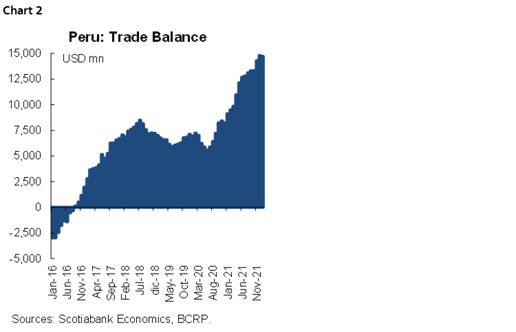 The conflict in Ukraine has been impacting Peru’s trade accounts more on the imports side than on the exports side. Only about 2% of Peru’s total trade is with Russia and the Ukraine. However, between 20% and 25% of imports are in fuel and commodity goods (soy, maize, wheat, fertilizer) that have been affected by events there. And higher freight costs have an impact across the board. Thus, the USD 1.0 bn trade surplus that Peru registered in January, which was the lowest in six months, can be taken as a harbinger of things to come. The 12-month rolling surplus stalled at USD 14.3 bn, below the December—and full year—figure of USD 14.8 bn (chart 2). January was, of course, before the Ukraine conflict began, but Russian saber rattling was already affecting markets.