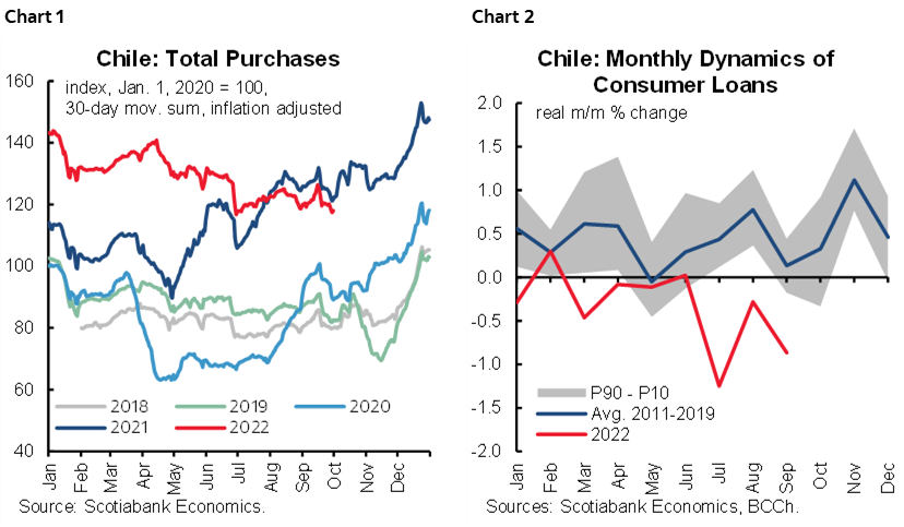 Purchases with credit and debit cards are confirming a hard-landing. On Friday, October 28, the statistical agency (INE) will release September retail sales, for which we expect a 13% y/y contraction, based on our high-frequency indicators of purchases with debit and credit cards (chart 1). We observe a deceleration in consumption imports, mainly durable goods, and a strong deceleration in banking credit (chart 2). In this context, we see a more intense usage of credit cards in low-income segments (especially in supermarkets), which is aligned with dwindling household disposable funds and the weakness of the labour market. These conditions could be reflected in a slight increase in the unemployment rate to up to 8.0% that we expect for the quarter ending in September (from 7.7% in the three months to August). The main drivers of the rise would be higher labour force growth compared to employment, which is below pre-pandemic levels.