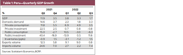 For the fourth quarter (Q4-2022) we project that GDP growth will accelerate to 2.3% mainly due to the increase in the export volumes with the start of operations at Quellaveco. Likewise, we anticipate that dynamic private consumption will continue since the factors that drove it during Q3-2022 will remain in force. Finally, private investment should remain depressed as persistent political noise and quarrelling between the government and Congress impacts business expectations.
