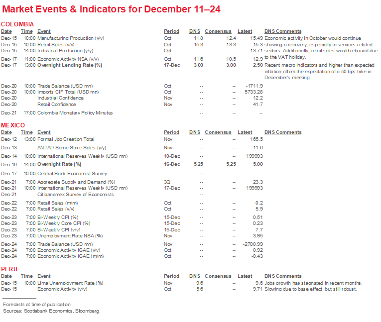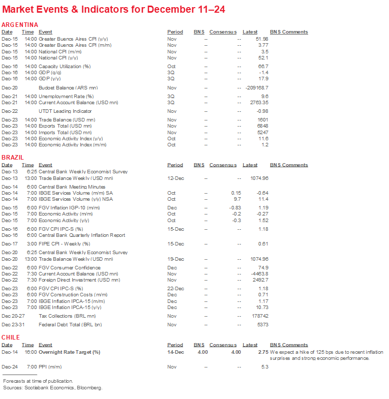 - A comprehensive risk calendar with selected highlights for the period December 11–24 across the Pacific Alliance countries, plus their regional neighbours Argentina and Brazil.