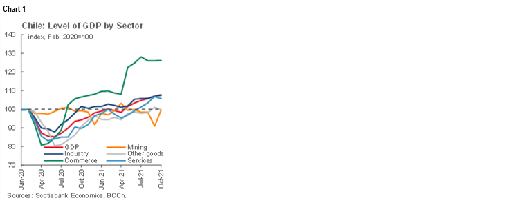 With regard to the economic indicators, on Wednesday, December 1, the central bank (BCCh) released the October economic activity index (IMACEC), which increased at a robust pace of 15% y/y (+0.8% m/m) despite high levels of political uncertainty. On a seasonally adjusted basis, the index shows a slowdown in services (-1.0% m/m) after a strong expansion in September (chart 1). Overall, the IMACEC posted a healthy-looking result and is not currently signaling an imminent slowdown alert. We believe that GDP should continue to show a favourable momentum in the first half of 2022 with either Gabriel Boric or José Antonio Kast as President.