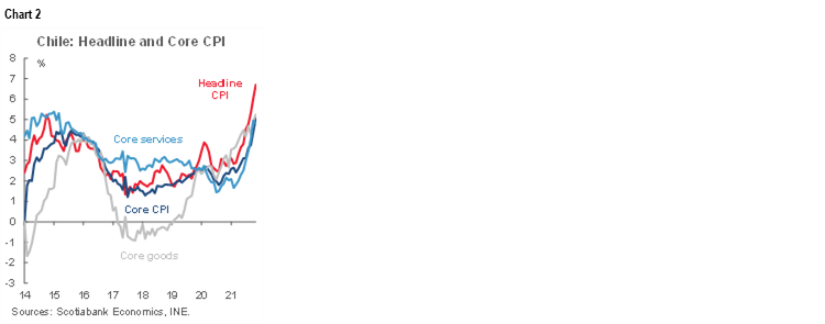 Finally, CPI increased 0.5% m/m in November (6.7% y/y), in line with our expectations, largely reflecting the depreciation of the Chilean peso and related pass-through effects (chart 2). The CPI excluding volatile products was 0.7% m/m, while the CPI core was 0.5% m/m (5.8% y/y), largely explained by increases in prices of goods (1.5% m/m; 7.5% y/y). Services took a break this month, with a fall of 0.1% m/m (4.8% y/y), but it is expected that they will continue to push inflation upward in the coming months. All in all, inflation remains above recent historical highs and the exchange rate has continued to depreciate, fueling additional pressures on costs (chart 2). We expect the central bank to hike the MPR by 125 basis points (bps), though it is likely considering a range of between 100 bps and 150 bps.