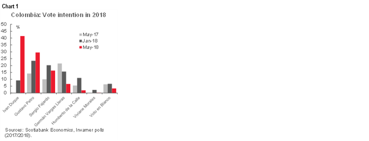 - Second, in Colombia the most intense phase of presidential campaigns starts in mid-January of the election year. In fact, according to the main polls, with only four months before the first round four years ago, the candidate Duque (today’s president) had only 9% of voter intentions by January 2018, while four candidates, Gustavo Petro (22%), Sergio Fajardo (19%), German Vargas Lleras (15%) and Humberto de la Calle (11%) had higher shares of voter intentions (chart 1). Moreover, on average, Colombian voters decide their vote one month before the election and around 10% of voters decide one week before. Therefore, we will not have a better idea of which candidates have a real chance of winning the presidency until February or March 2022.