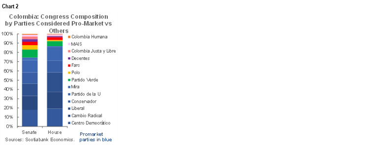 - Fourth, historically Colombia has had a very diverse Congress, although pro-status quo parties form the majority (chart 2). Although we expect some small changes to the composition of Congress after the March elections, we anticipate that pro-status quo parties will continue to make up something more than 75% of Congress. Therefore, the next president must have the skills needed to negotiate with many minorities in order to be able to pass significant reforms.