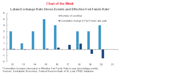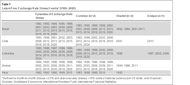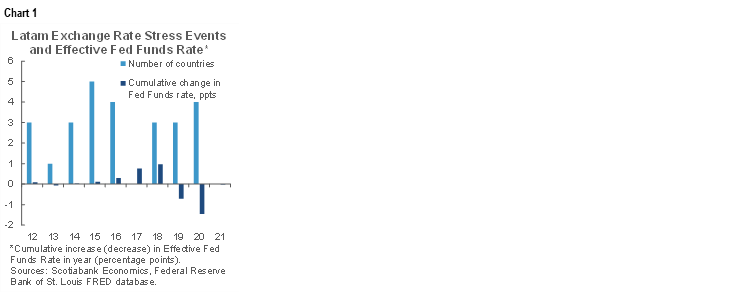 These effects account for a “fear of floating,” leading central banks intervene to moderate the pace of currency depreciation. Going forward, attention is thus likely to focus on possible currency fluctuations from the Fed’s rebalancing of monetary conditions. To assess the potential for such episodes, we have identified years in which the Latam Five countries have experienced periods of exchange market stress, as defined by two admittedly ad hoc criteria: large (>2.5%) month-to-month depreciations in the currency that coincide with significant (>10%) year-over-year changes (table 1). A quick look at the incidence of these events and the 2015-2018 Fed tightening cycle (chart 1) suggests, not surprisingly, that the stress events are more likely to be triggered by the start of a Fed tightening cycle as international portfolios are rebalanced.