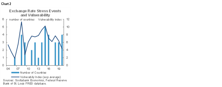 That conclusion says little about the region’s vulnerability to such episodes going forward, however. To address this question, a simple index made up of four indicators (inflation, external debt as a share of GDP, international reserves in months of imports, current account balances) was constructed, with higher values of the index representing increased vulnerabilities (chart 2). The index signals increased vulnerabilities around the global financial crisis and the Fed’s pre-pandemic tightening cycle, but not stress events associated with the COVID-19 pandemic given the unprecedented and unforeseeable economic and financial shocks associated with public health lockdowns. Moreover, while the index does not signal obvious region-wide vulnerabilities looking ahead (in part, perhaps, because of its rudimentary structure), some country-specific changes in underlying indicators are noteworthy. Inflation in Mexico, current account deficits in Chile, and external debt as a share of GDP in Colombia all warrant close monitoring. In this respect, while a Janus-faced look at exchange rate stress events does not necessarily predict exchange rate stress events that justify “fears of floating”, a prudent reading of past global financial tightening cycles does not support complacency in the face of potential risks.