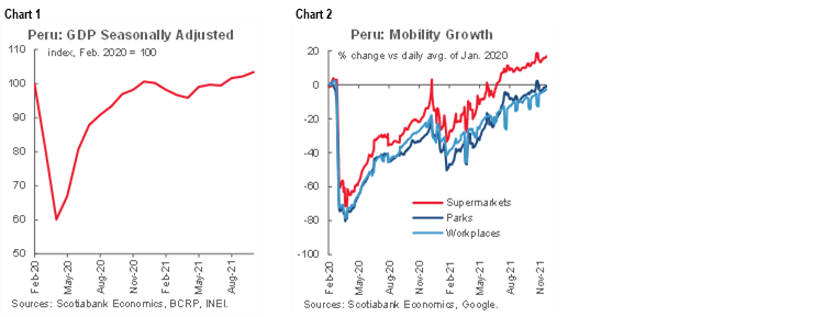 It’s been an exhausting 2021. It’s been a year in which it seemed that Peru could not catch a break in its political turbulence. And yet, it would be hard to tell from just looking at the economic data that anything was really amiss. GDP growth, both the aggregate and domestic demand components, have surprised on the upside to such an extent that we see upside to our already robust 12.3% GDP forecast for 2021 (chart 1). There seems to be little evidence in high-frequency data—such as traffic, electricity demand, and cement demand—that the change in government, as bumpy as the ride has been politically, has affected growth trends. All high-frequency indicators and most mobility indicators are mildly above 2019 levels (chart 2). So is GDP, up 0.5% in the year-to-September, versus 2019. Most analysts were not expecting a return to 2019 levels until well into 2022 (table 1).
