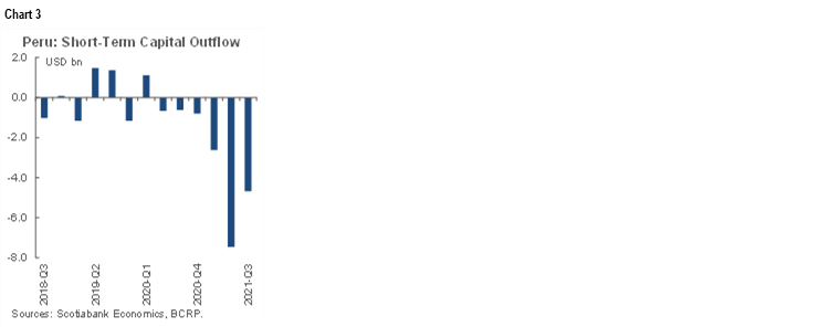 A prudent unwinding of fiscal measures would have a salutary effect, reassuring international investors and domestic savers of government commitments to sustainable public finances. Governments in the region have already laid out plans to restore fiscal positions; in Colombia, as our experts in Bogota highlight in the country notes below, important reforms to ensure long-term fiscal sustainability will have to be passed in the new year, making the upcoming elections a potential source of uncertainty. Meanwhile, the vicissitudes of erratic policymaking in Peru have contributed to large capital outflows by domestic residents, as Scotiabank’s team in Lima highlight (see discussion below).