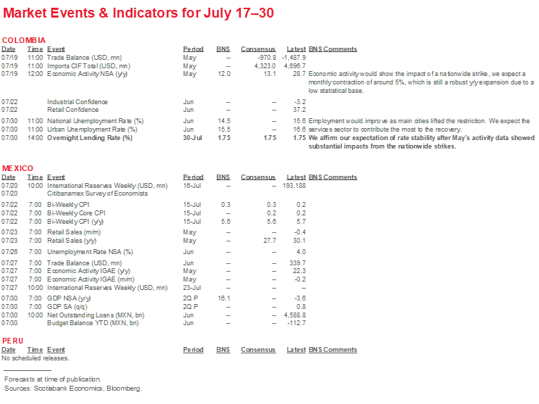 - A comprehensive risk calendar with selected highlights for the period July 17–30 across the Pacific Alliance countries, plus their regional neighbours Argentina and Brazil.