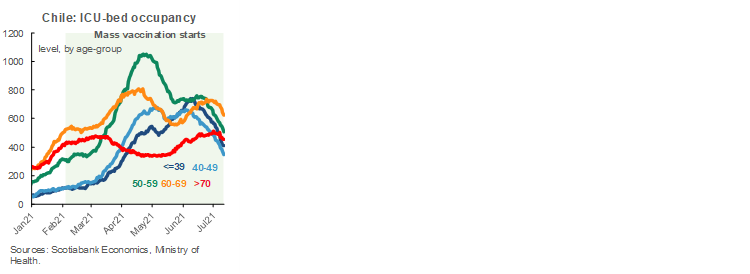 Following a decrease in new cases and hospitalizations related to COVID-19 (chart 1), on July 8th Chilean authorities announced adjustments to the “Paso a Paso” plan reducing mobility restrictions for fully vaccinated individuals. Capacity restrictions on certain activities were also updated, providing increased flexibility in the operation of restaurants, gyms and cinemas and reducing curfew hours, depending on the level of infections and vaccination by region.