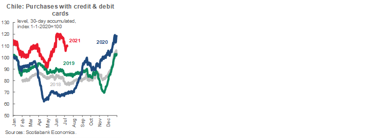 Meanwhile, the economic recovery continues. Retail Sales remained high in June, but we observed some deceleration in July, driven by Supermarkets and Department Stores as well as the effects of seasonal patterns (CyberDay). Our high-frequency indicators point to a slowdown in purchases with credit and debit cards at the beginning of July (chart 2), suggesting that the high liquidity coming from fiscal aid and the withdrawal of pension funds is being consumed, though a significant proportion is likely being saved.