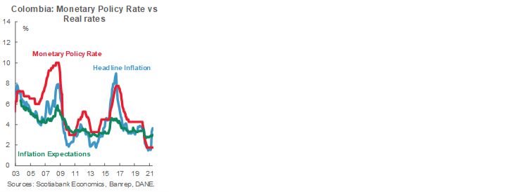 In this respect, while BanRep staff revised up their inflation and GDP projections in the most recent forecast round, the economy has demonstrated considerable resilience and growth and inflation will likely continue to run above BanRep expectations. Meanwhile, the COP has depreciated after the last monetary policy meeting, and the downgrade of Colombia’s rating put some additional pressure on the FX that can affect inflation expectations.