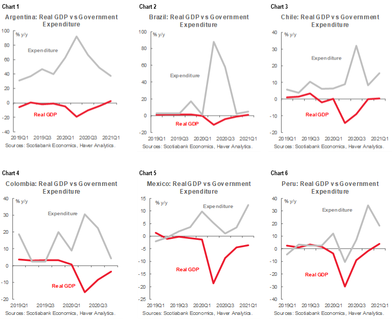 Latam governments responded to public health and economic challenges with a range of measures to support vulnerable populations. These actions were taken despite a trifecta of limited fiscal space, falling output, and shrinking revenues; the counter-cyclical fiscal responses are shown in charts 1–6. As the charts illustrate, most governments in the region increased expenditures early in the pandemic even as real GDP was falling. Mexico is an exception: the government there responded to the pandemic by curtailing expenditures. Elsewhere, governments ramped up spending to ameliorate the effects of lockdowns on incomes and bolster public health resources.
