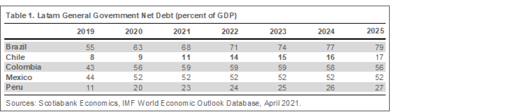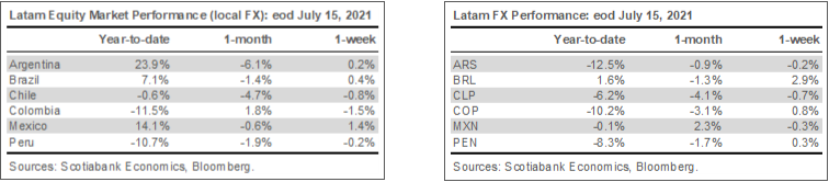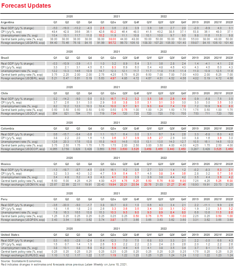 Meanwhile, last month’s slightly hawkish dot plot chart of Fed governors’ interest rate expectations has put Latam central bankers on notice—their challenge is to watch the plots and mind the (output) gaps as their economies recover. On June 24th, Mexico’s Banxico surprised markets with a policy rate hike that our team in Mexico City views as the start of front-loaded tightening cycle designed to anchor inflation expectations (see the July 9 Latam Flash). Likewise, in Chile, the central bank (BCCh) raised its key policy rate 25 basis points on July 14th despite June inflation surprising on the downside, in what our analysts in Santiago view as an early start to the renormalization process (see the July 14 Latam Daily). And while other regional central banks have thus far remained on the sidelines (see discussions of Colombia’s BanRep and Peru’s BCRP below), the moves by Banxico and BCCh underscore the uncertainty surrounding the future path of interest rates and the risks that higher rates could pose to fiscal balances.