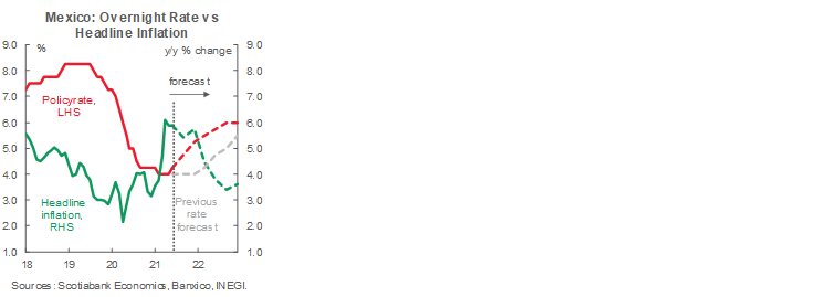 - Banxico’s proactive move to prevent a temporary spike in inflation spilling over into longer-term expectations prompts us to revise our call on policy rates.