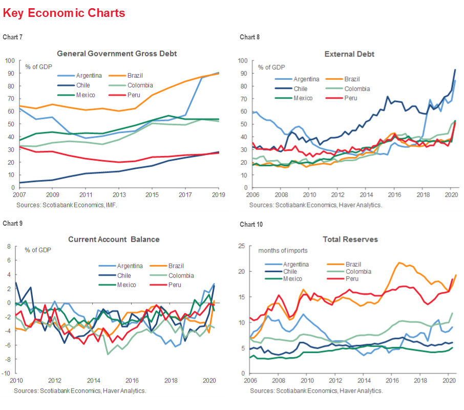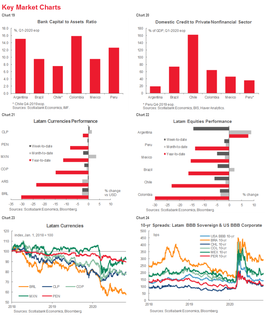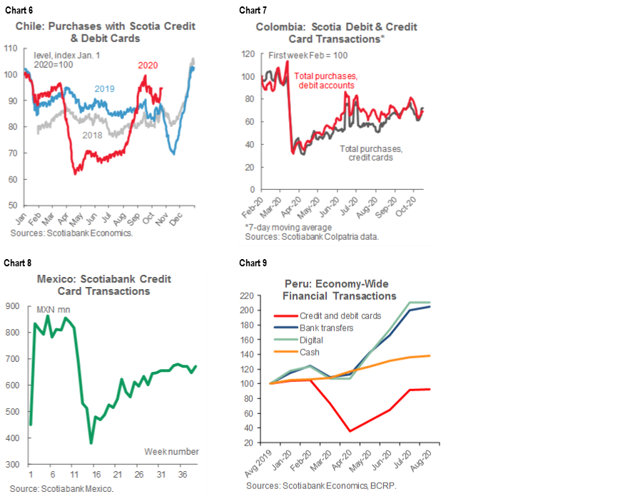 Transactions volumes. Looking at Scotia proprietary data, credit and debit volumes at current at 95% of their January 2020 levels in Chile (chart 6), 6.9% higher than in October 2019 during the civil unrest, owing in part to fiscal stimulus and pension withdrawals. In Colombia, VAT holidays spiked Scotia card transactions in June and July, but volumes currently stand at 69% of February levels (chart 7). Scotiabank Mexico’s card weekly card volumes were at 78% of February’s numbers as of end-September (chart 8). Meanwhile, in Peru, the accelerated re-opening has lifted finance-system-wide card transactions to 93% of average volumes in 2019 (chart 9), while wire and digital transfers are up 205% and 210%, respectively, over 2019’s averages.