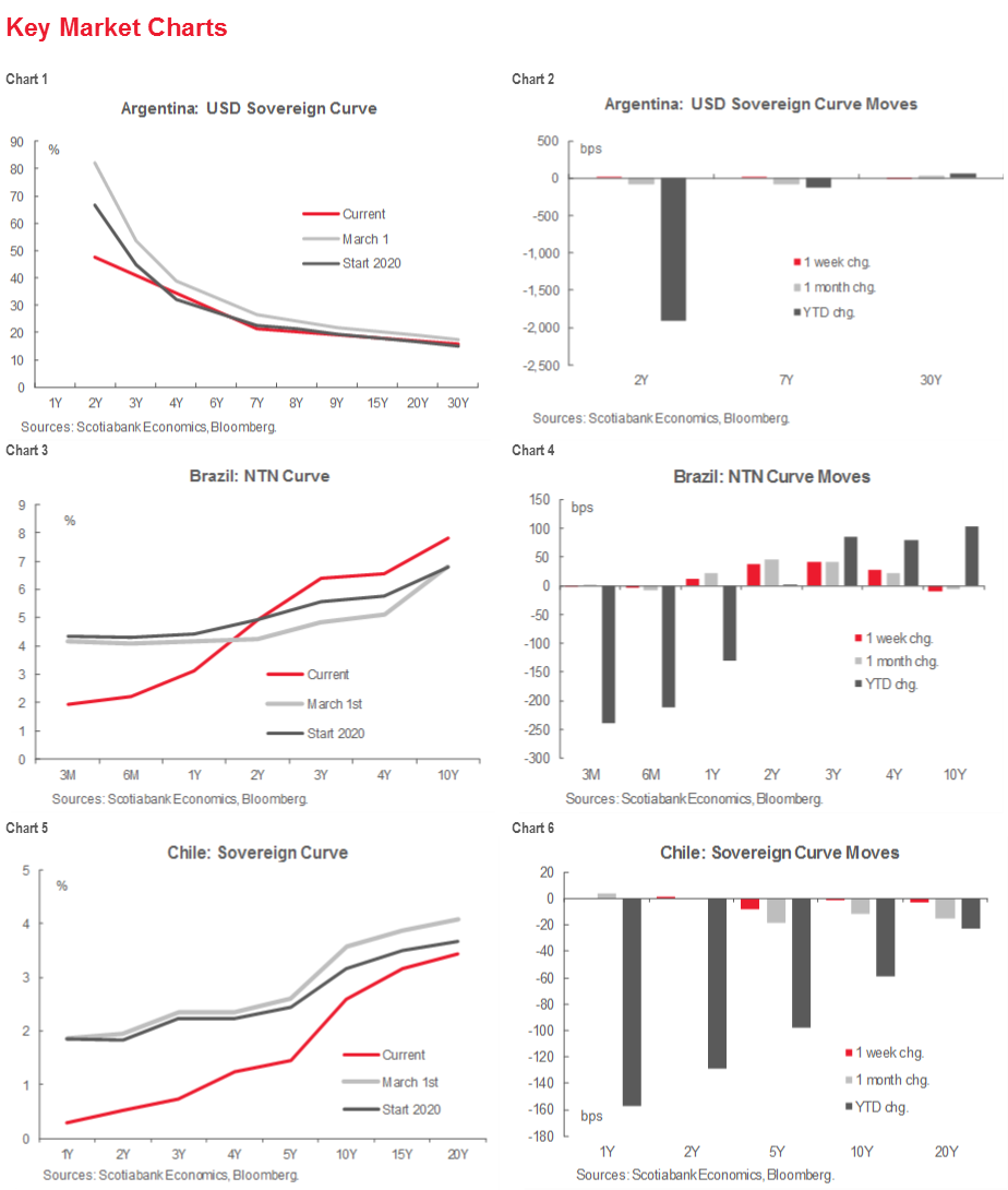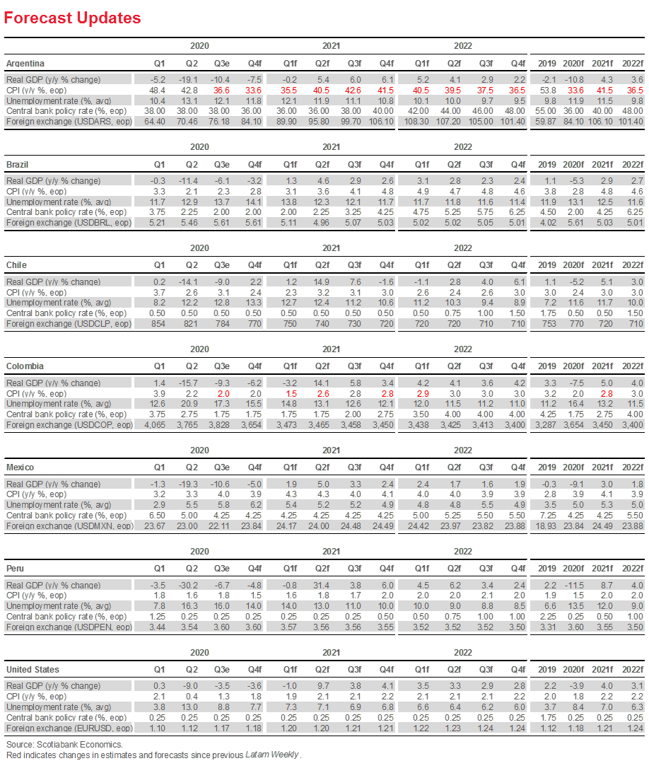 After comprehensive updates at the beginning of October, our forecasts are nearly unchanged in this Latam Weekly. We revised our inflation path for Argentina in light of the even stronger-than-expected damage to the ARS in the blue-chip swap market, which is set to intensify pass-through effects, particularly as import demand has stepped up as Argentines scramble to access dollars at the cheaper official rate. We now see sequential inflation averaging 3% m/m over the coming quarters. In contrast, our team in Bogota fine-tuned its inflation outlook, edging end-2021 headline inflation down from 3.0% y/y to 2.8% y/y.