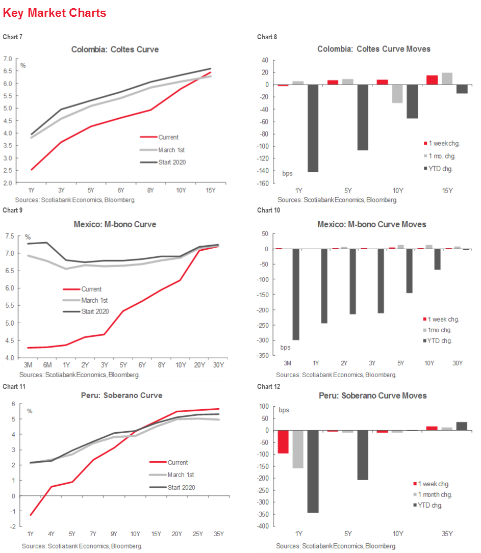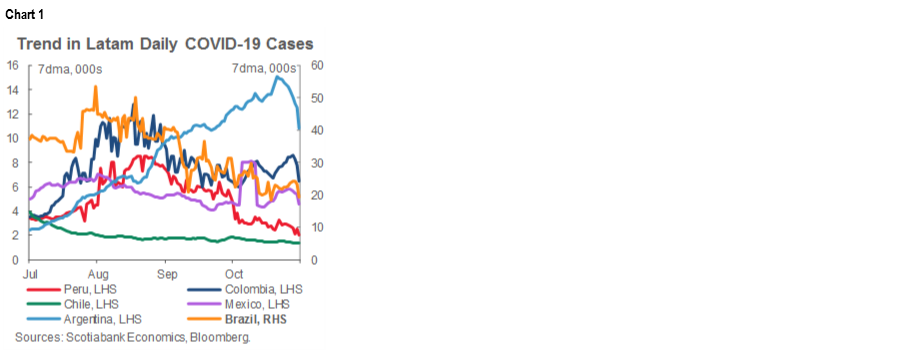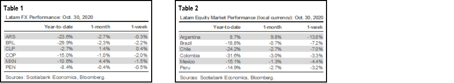 During this past week Latam risk assets traded broadly in line with fears concerning rising COVID-19 numbers in Europe and the US that, in many cases, are exceeding the worst periods of the initial waves of Q2-2020. Extensive lockdowns have already begun across Europe and the UK, with more likely to follow in parts of Canada and the US. Latam FX had a tough week (table 1) amidst a broadly-based EM sell-off that has room to carry on further owing to what appears to have been long positioning built over previous weeks. The BRL, MXN, and COP were amongst the worst performers across the entire EM FX complex. Nevertheless, Latam currencies weren’t able to provide a sufficient shock-absorber for the region’s equity markets that also saw strong sell-offs (table 2). In Argentina, the Merval’s drop received a further kick from the authorities’ moves to clamp down on the parallel ARS market.
