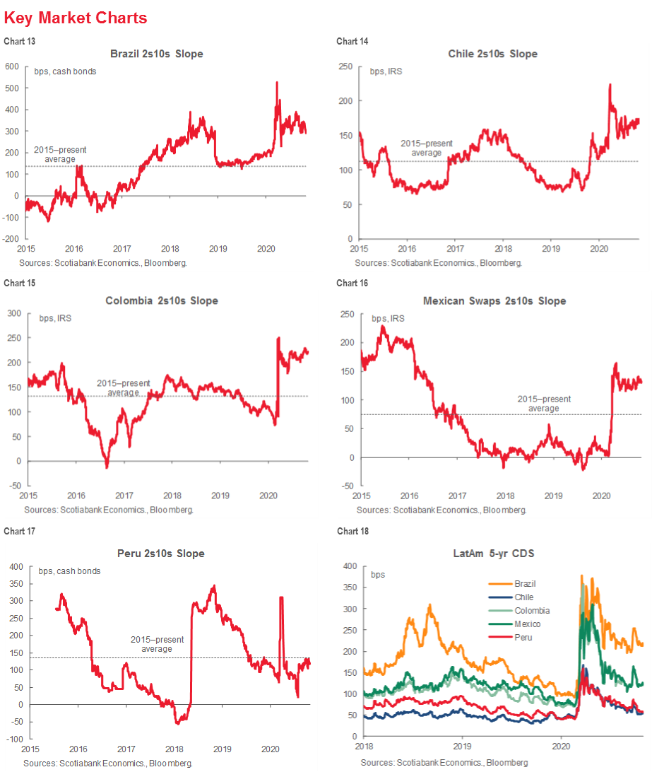 Meanwhile, the pace of the recovery has slowed. We expect September GDP to remain down by -8% y/y, which is not much of an improvement over the -9.8% y/y recorded in August. This strains our -11.5% full-year forecast a bit, although not enough to change it yet as we see signs of a sharper improvement in Q4. The agroindustry is particularly strong, with 20% export volume growth in August. At the same time, mining, which was struggling to get out of COVID-19’s shadow, apparently has finally done so in October, with reports of healthy recent output gains. The third leg to the table is public sector investment, which is also showing hopeful signs of a vigorous improvement in Q4. Perhaps the most pleasant surprise comes from the real estate and home construction market. September was the third consecutive month in which home sales surpassed pre-COVID-19 levels. As proof that this was not a data distortion, cement sales soared 10% y/y in September, and mortgage loans in September rose for the first time since February. In sum, the third quarter recovery has been exasperatingly slow, but the fourth quarter holds promise of an acceleration.