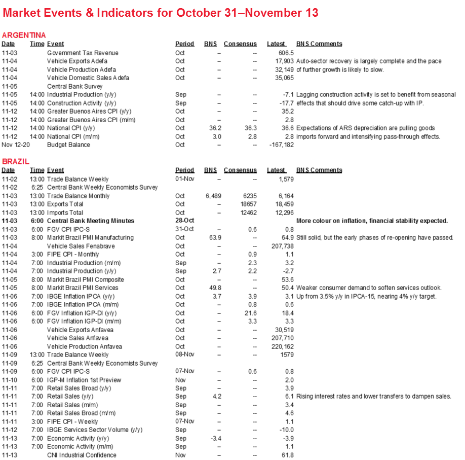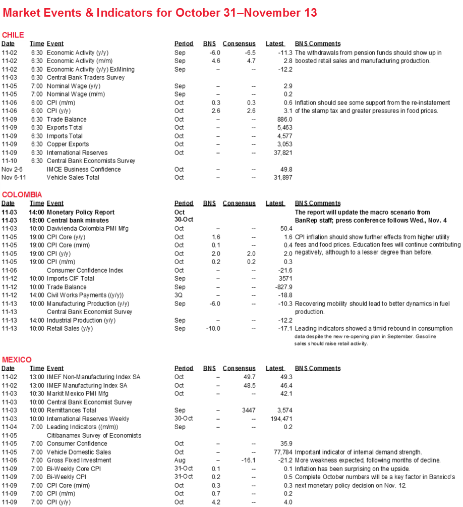 Inflation dominates macro data across the next two weeks in Latam. Price increases are expected to have picked up during October in Brazil (Nov. 6), Mexico (Nov.9), Argentina (Nov. 12); held steady in Colombia (Nov. 5); and pulled back a bit in Chile (Nov. 6). Peru leads the region’s October inflation prints on Nov. 1, but countervailing forces leave us low conviction on how Lima’s prices evolved in the month. See the Market Events & Indicators risk calendar at the back of this report for more details.