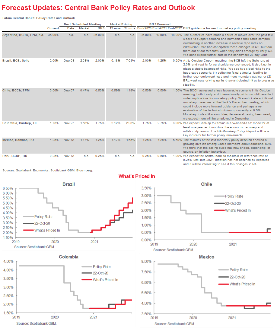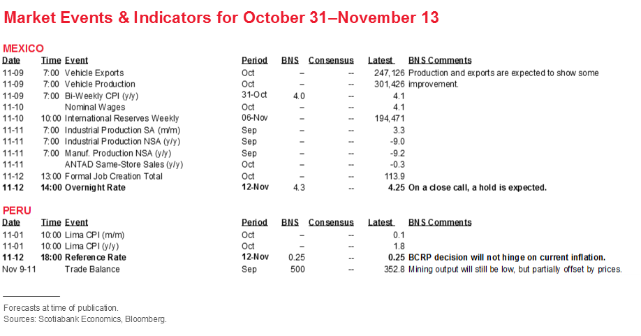 The week ahead sees the arrival of minutes and a quarterly MPR in Colombia, and minutes from Brazil. Rate decisions come the following week, both on November 12, from Mexico’s Banxico and Peru’s BCRP, where holds are expected. Detailed considerations are sketched out below.