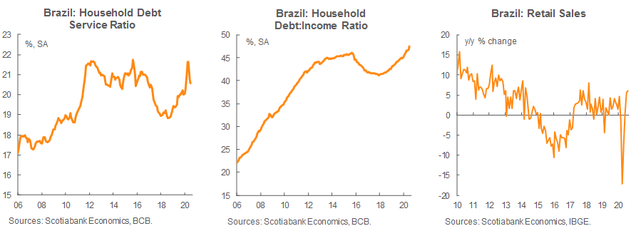 In this regard, the BCB Copom’s pledge in its forward guidance to keep rates low for a prolonged period could help soften the blow to consumers from declining government support measures, which we are set to see taper progressively more quickly through Q4-2020 and into 2021. However, if—contrary to the BCB’s signals—domestic market rates continue to rise as they have been doing (2-year DI rates are up about 100 bps since September), domestic consumption should soften as 2020 draws to a close. Rising interest rates are an especially important consideration in the outlook for consumer demand given Brazil’s rising household debt-to-income ratio.