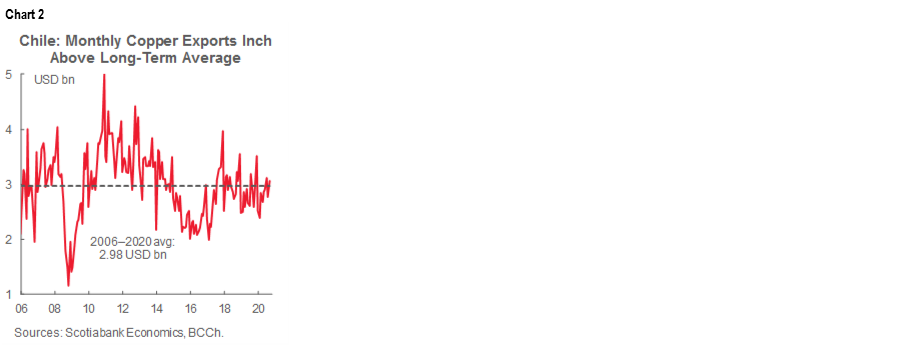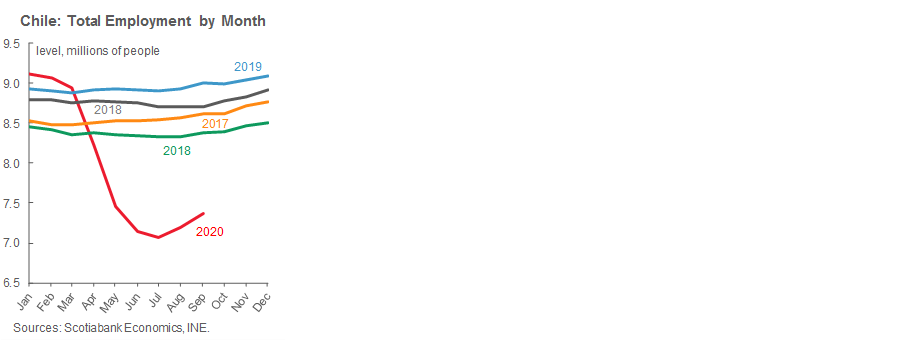 Chile just passed a busy week in terms of political developments and economic releases. In the plebiscite held on Sunday, October 25, Chile’s citizens approved by wide margins a re-write of the country’s 1980 constitution through a popularly elected assembly. The relatively high participation rate at 50.9% was a pleasant surprise. Preliminarily, it appears that there was strong turnout amongst first-time voters, which implies an increased interest in politics among young people. Among the 78% who chose to reform the constitution and the 79% who voted to do so through a 100%-elected convention, a wide diversity of views and groups are represented. This indicates that the election of members to the Constitutional Assembly on April 11, 2021 will be critical in determining whether there is likely to be a set of coalitions that would allow the Convention to reach the two-thirds majority required to approve a new constitutional draft and send it to voters for review in a mandatory plebiscite in early-2022. If the draft receives more than 50% of votes in the 2022 poll, it would become Chile’s new constitution; if not, the 1980 constitution would remain valid. All in all, the streets should be dramatically calmer in the coming weeks, although some small groups of protesters may continue to raise proposals for inclusion in the drafting of the new constitution in public demonstrations.