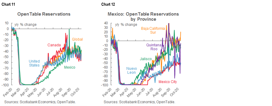 Open table reservations. As of October 28, Mexican OpenTable bookings were down -38% y/y while global bookings were down -39% y/y, with a -46% y/y drop in Canada and a -44% y/y decline in the US (chart 11). Mexico’s numbers were helped by tourist zones that have seen reservations firm up: while Mexico City and Nuevo Leon (Monterrey) were both off by about -50% y/y, tourists looking for a break from quarantines lifted reservations by 20% y/y in Baja (Cabo San Lucas), and held reservations to declines of only -15% y/y in Jalisco (Puerto Vallarta) and -6% y/y in Quintana Roo (Cancun), as shown in chart 12.